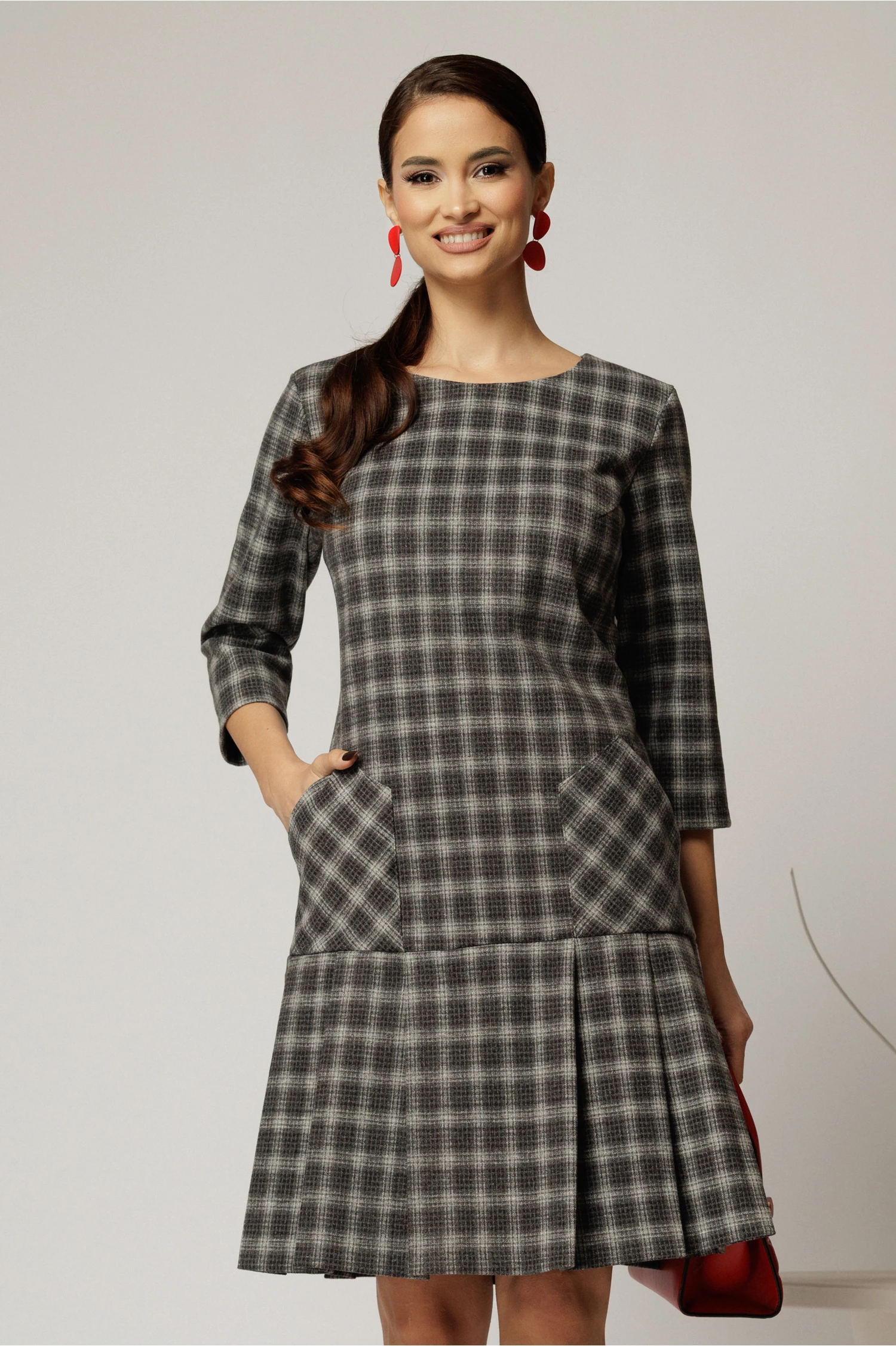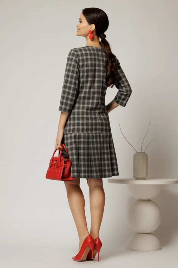 Rochie office din lana in carouri gri si pliuri la fusta