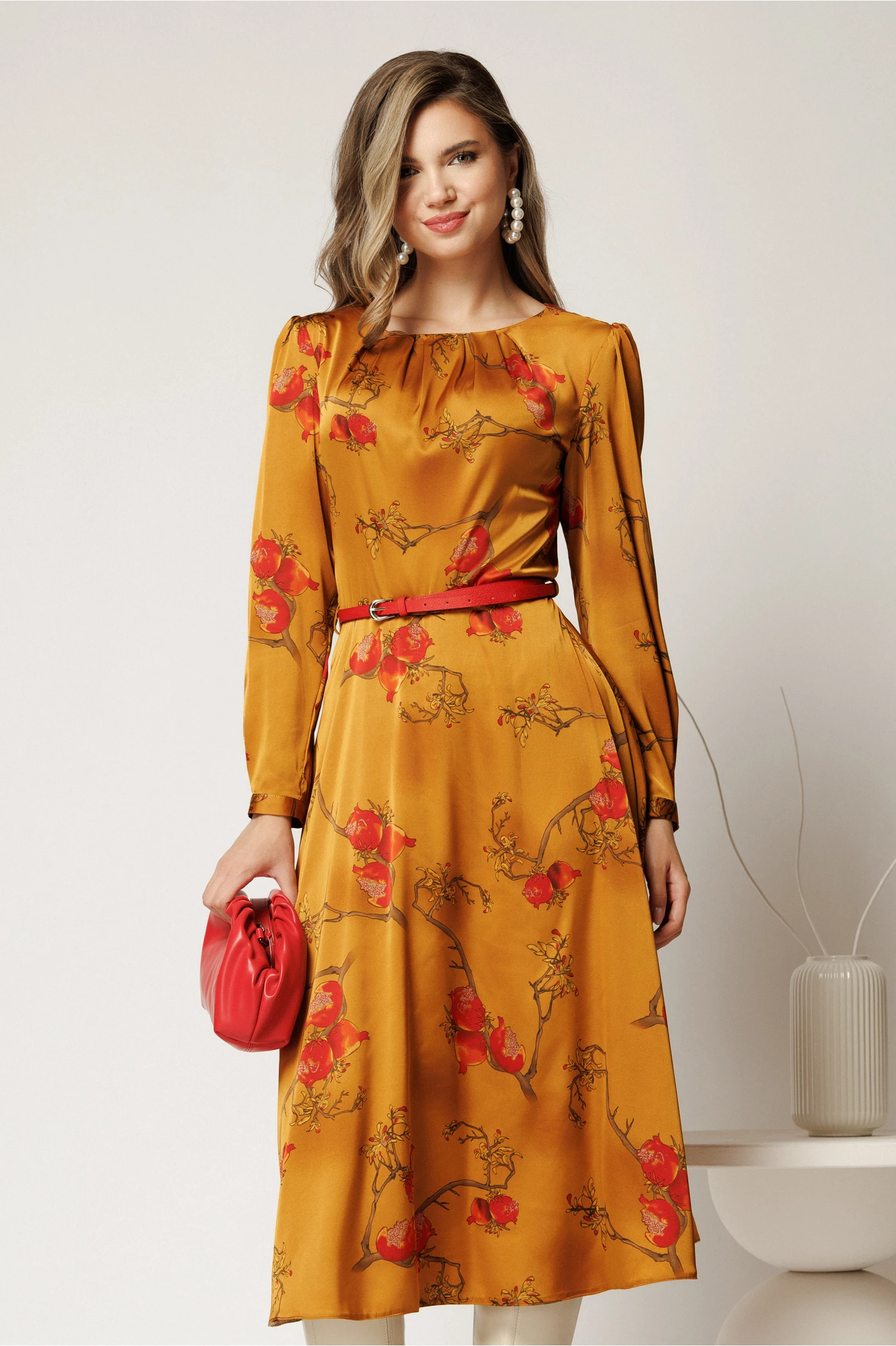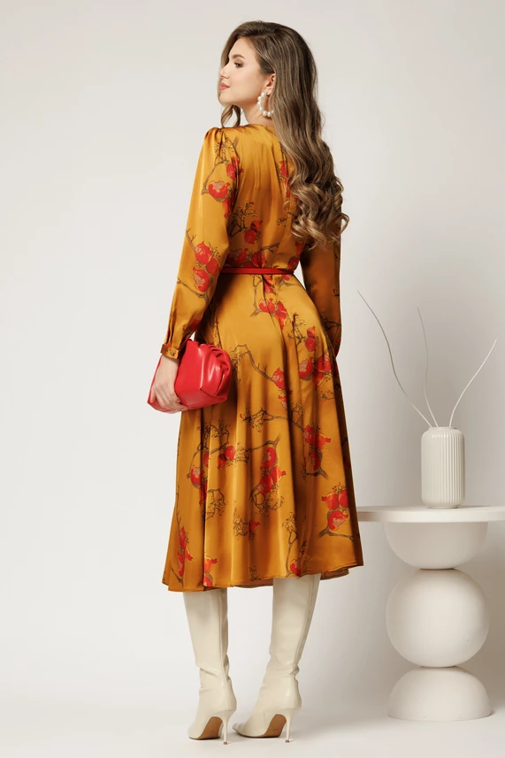 Rochie clos midi galben mustar cu imprimeu si curea in talie
