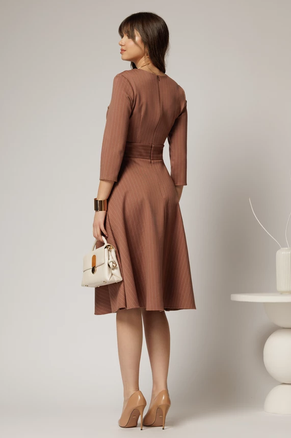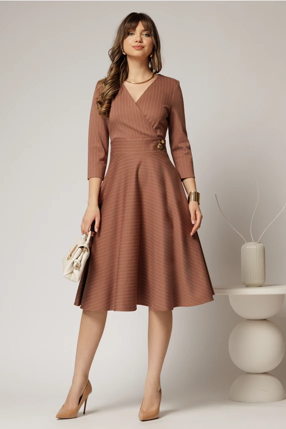 Este o rochie midi bej in dungi din jerse, cu fusta in clos si decolteul petrecut. Rochia are maneci trei sferturi si detaliu auriu pe talie.