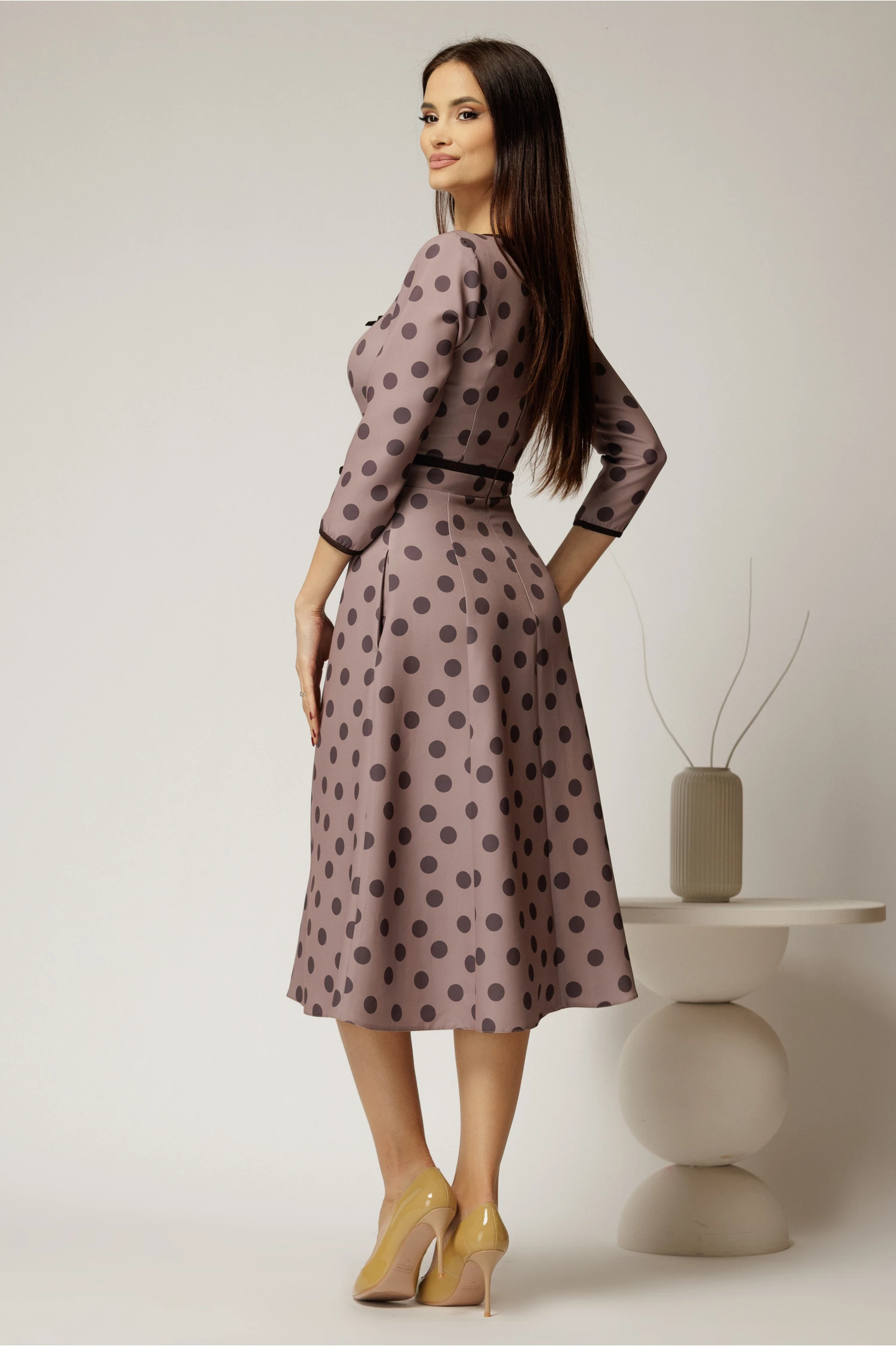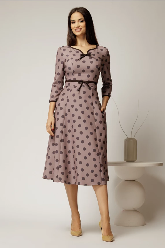 Este o rochie midi bej cu buline, cu un croi clos foarte comod. Rochia are maneci 3/4, mic decupaj in V la decolteu si este accesorizata cu funde.
