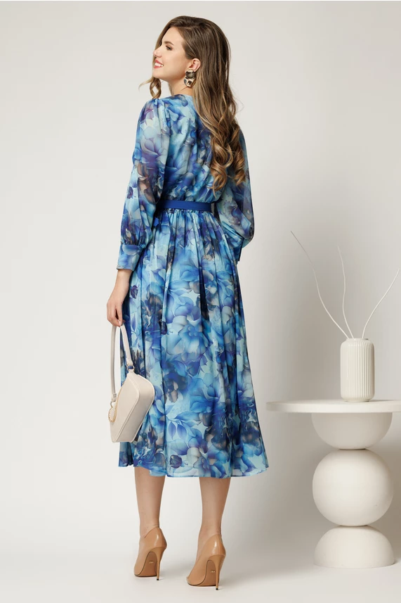 Este o superba rochie midi clos din voal cu imprimeu in nuante de albastru. Decolteul este petrecut, iar talia este accesorizata cu o curea subtire.