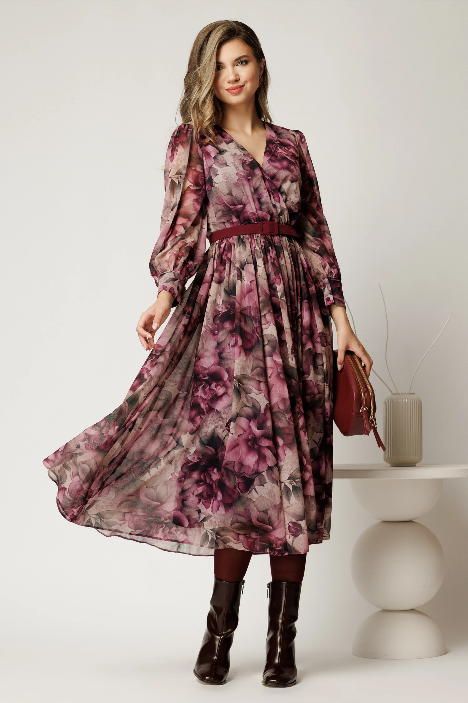 Este o superba rochie midi clos din voal cu imprimeu in nuante de magenta. Decolteul este petrecut, iar talia este accesorizata cu o curea subtire.