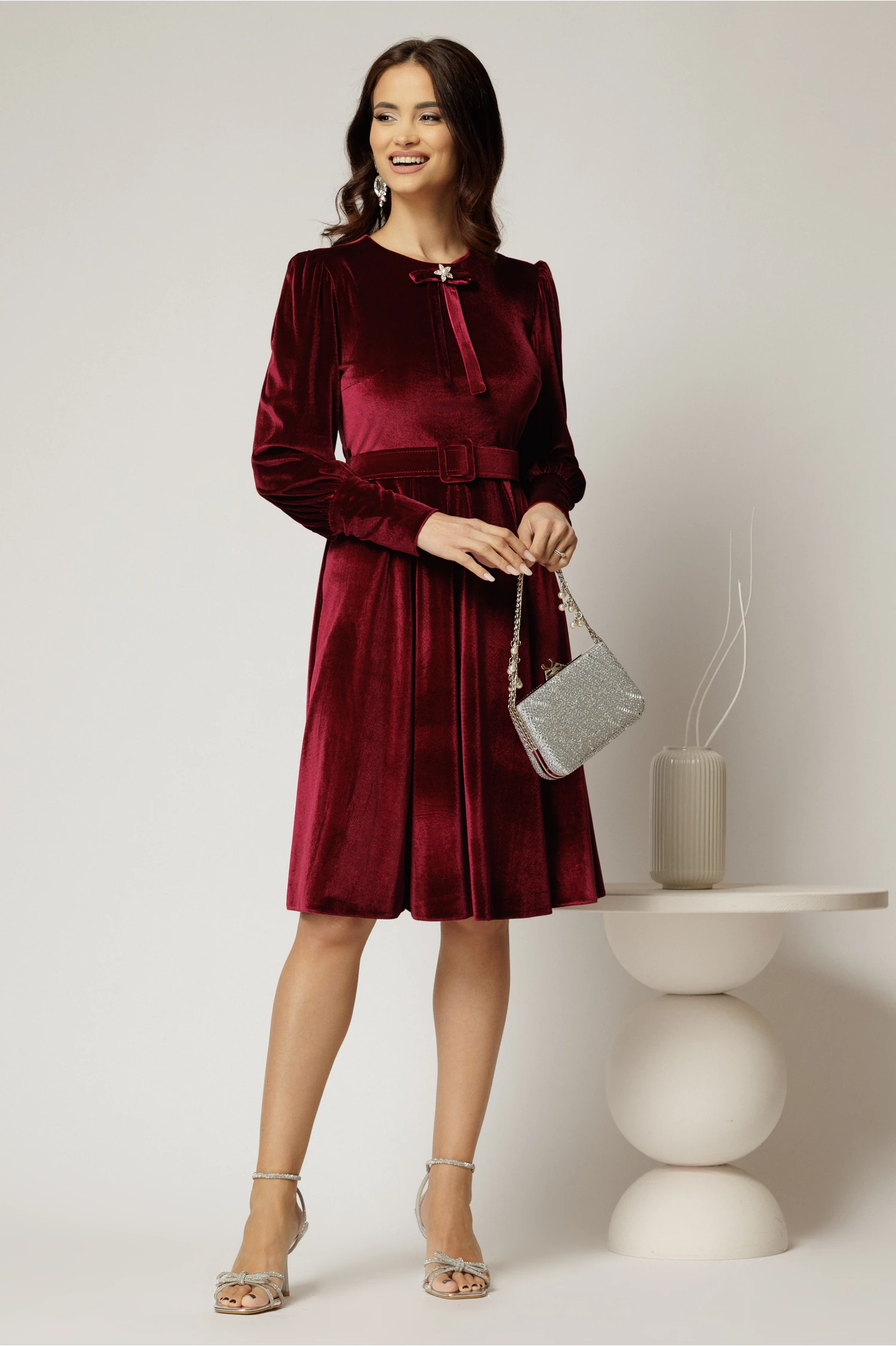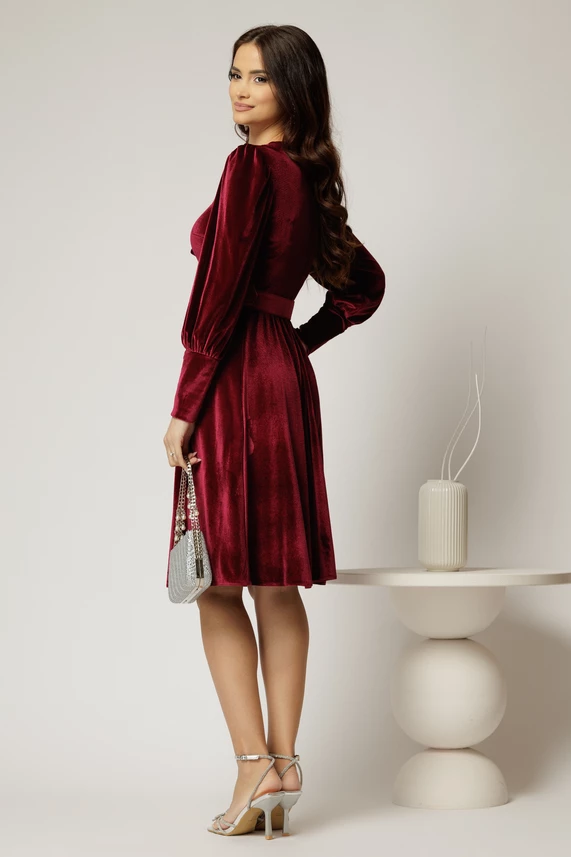 Este o rochie casual eleganta din catifea bordo, accesorizata cu o funda cu brosa la guler. Rochia are croiul clos, maneci lungi si talia accesorizata cu o curea lata.