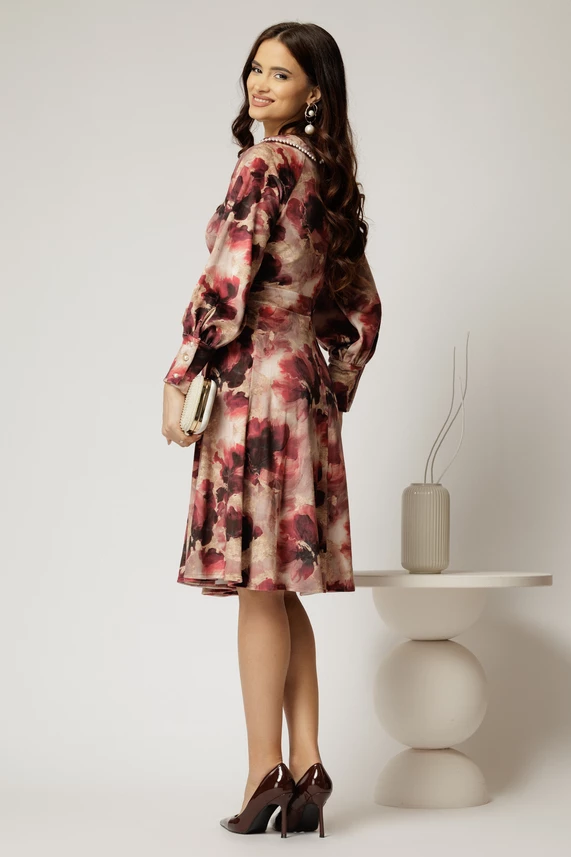 Este o rochie casual elegant, cu imprimeu grena si perle la guler. Rochia are croi clos si maneci bufante cu manseta si inchidere cu nasturi.