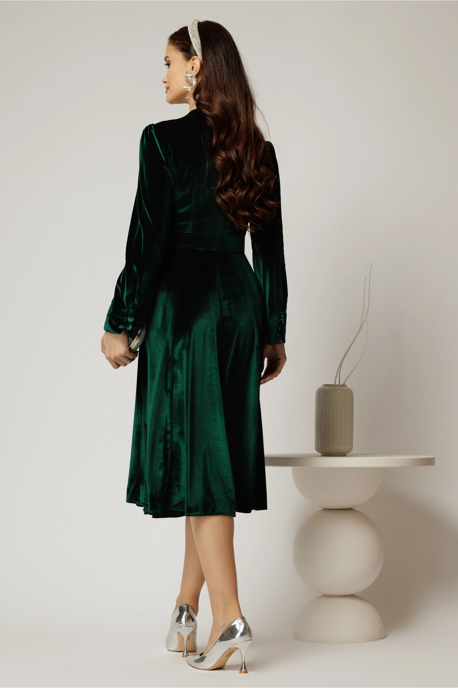 Este o rochie eleganta din catifea verde, cu un croi in clos, ce evidentiaza orice silueta. Rochia are gulerul tunica, inchidere cu nasturi pe bust si talia accentuata de o curea lata.