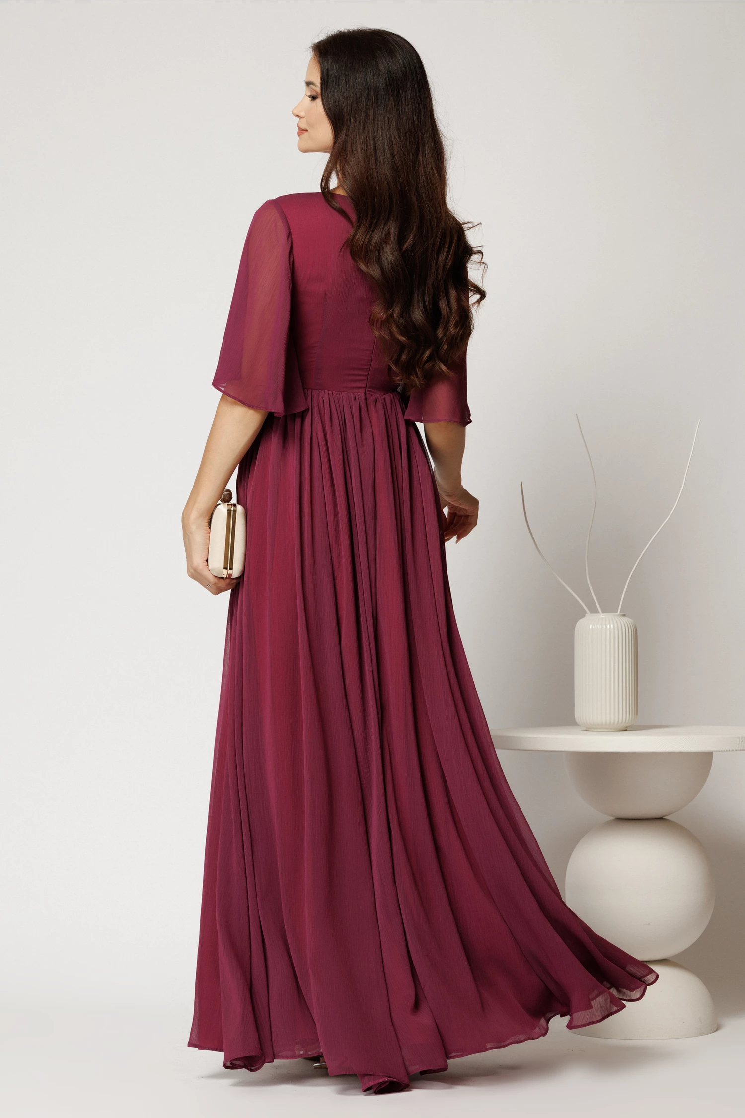 Rochie lunga vaporoasa din voal cu crapatura maxi pe picior. Are decolteu rotund, maneci scurte tip fluture si croi clos.