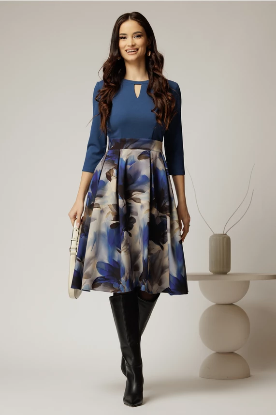 Este o rochie midi de zi cu fusta cu pliuri si imprimeuri. Rochia are un decupaj discret la decolteu si maneci trei sferturi.