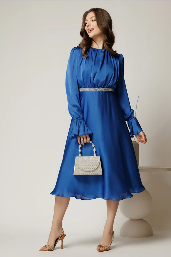 Rochie DY Fashion midi albastra din voal satinat in clos cu perle in talie