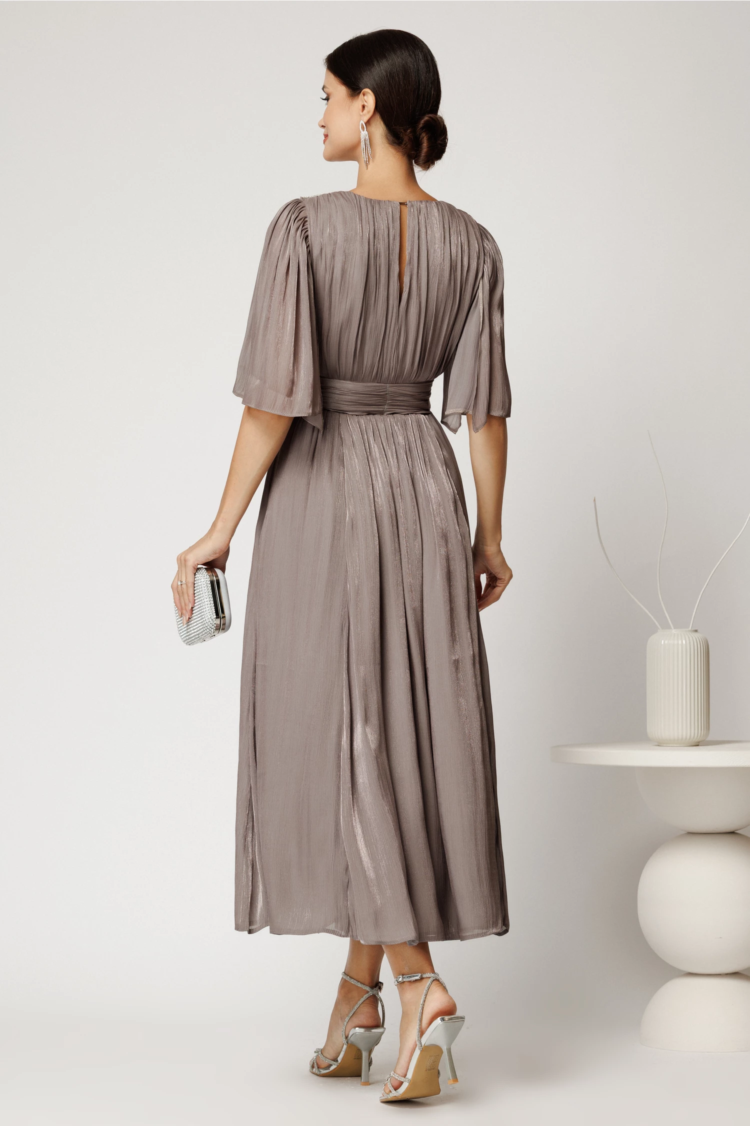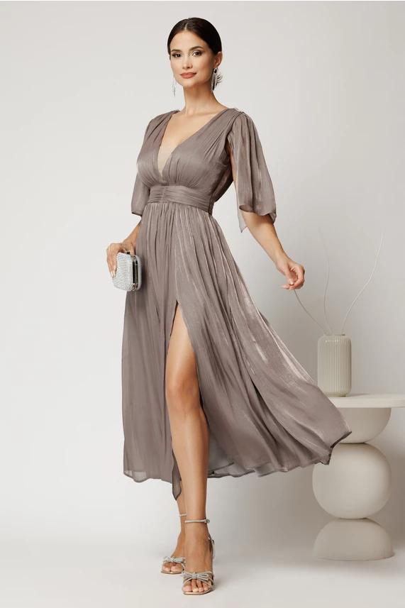 Impresioneaza la orice eveniment cu aceasta rochie cu decolteu adanc în V, maneci tip fluture si fusta plisata cu crapatura pe picior. Talia marcata si materialul fin, usor stralucitor, ofera o silueta eleganta si feminina. Ideala pentru nunta, botez sau petreceri de seara.