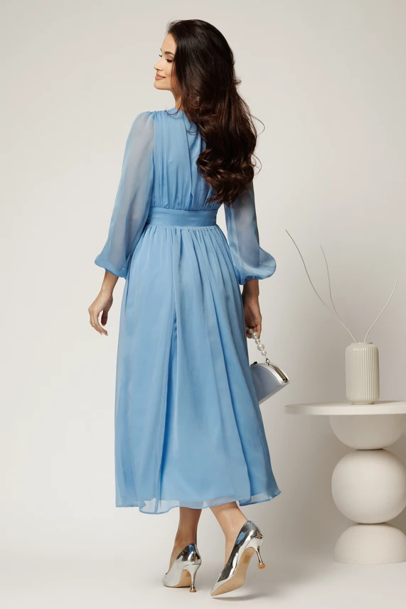 Rochie DY Fashion midi bleu din voal in clos cu funda maxi in talie