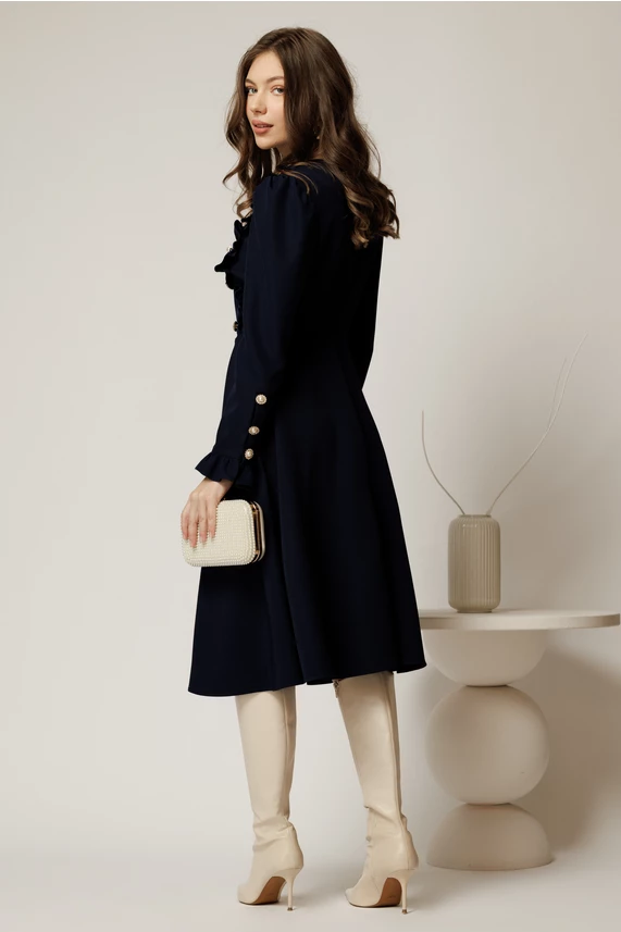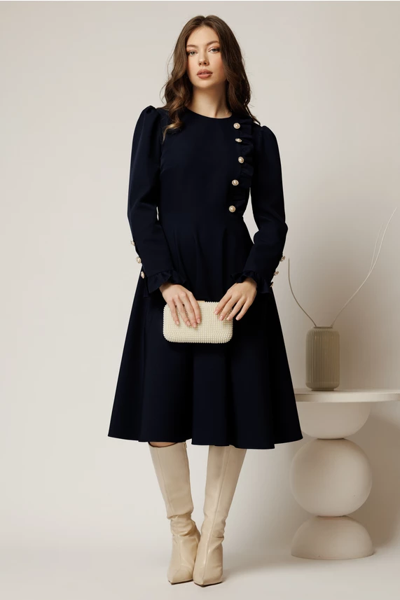 Este o rochie eleganta midi clos de ocazie de culoare bleumarin, cu nasturi decorativi si volanase pe bust.