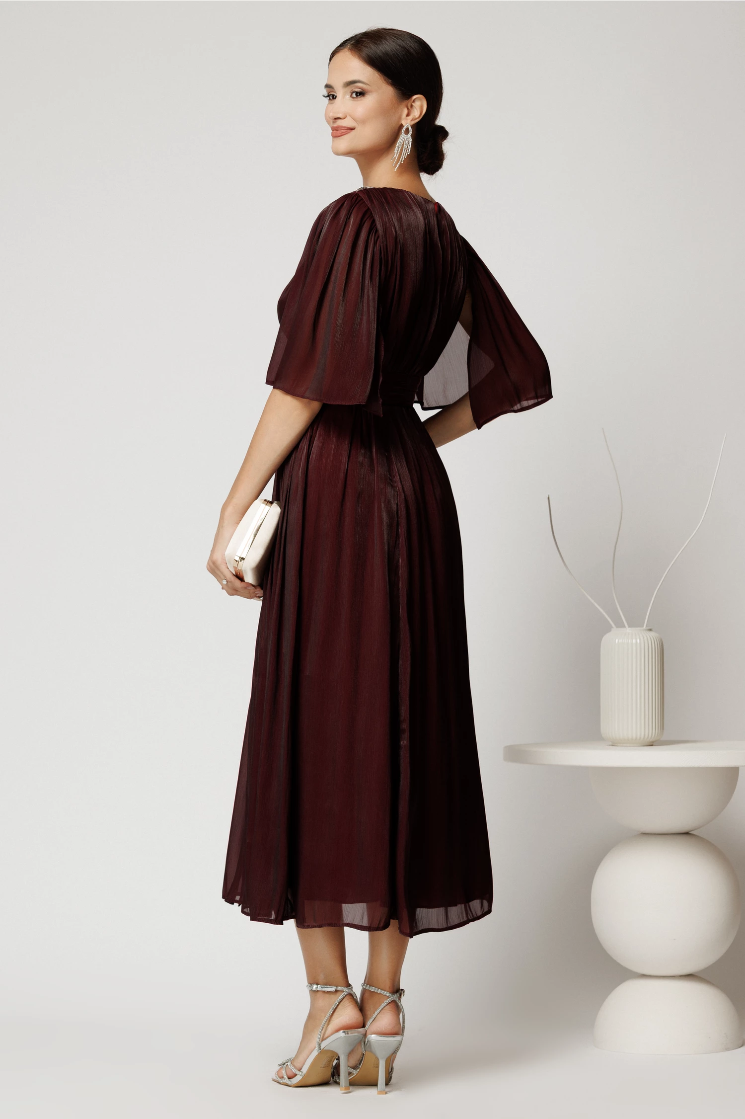 Rochie DY Fashion midi bordo din voal in clos cu aspect sidefat si maneci sparte