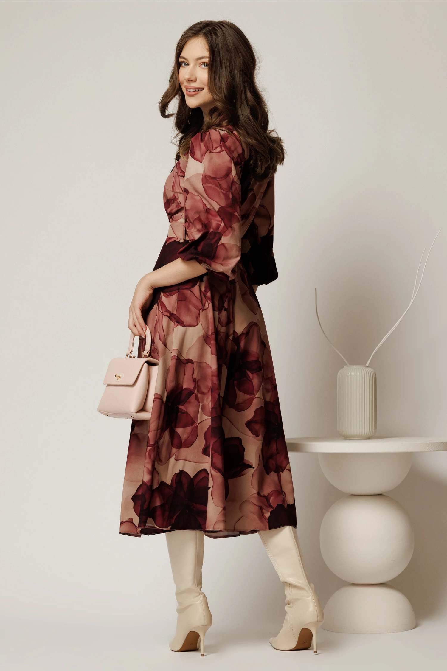 Rochie DY Fashion midi cu imprimeu magenta cu maneci bufante si curea in talie