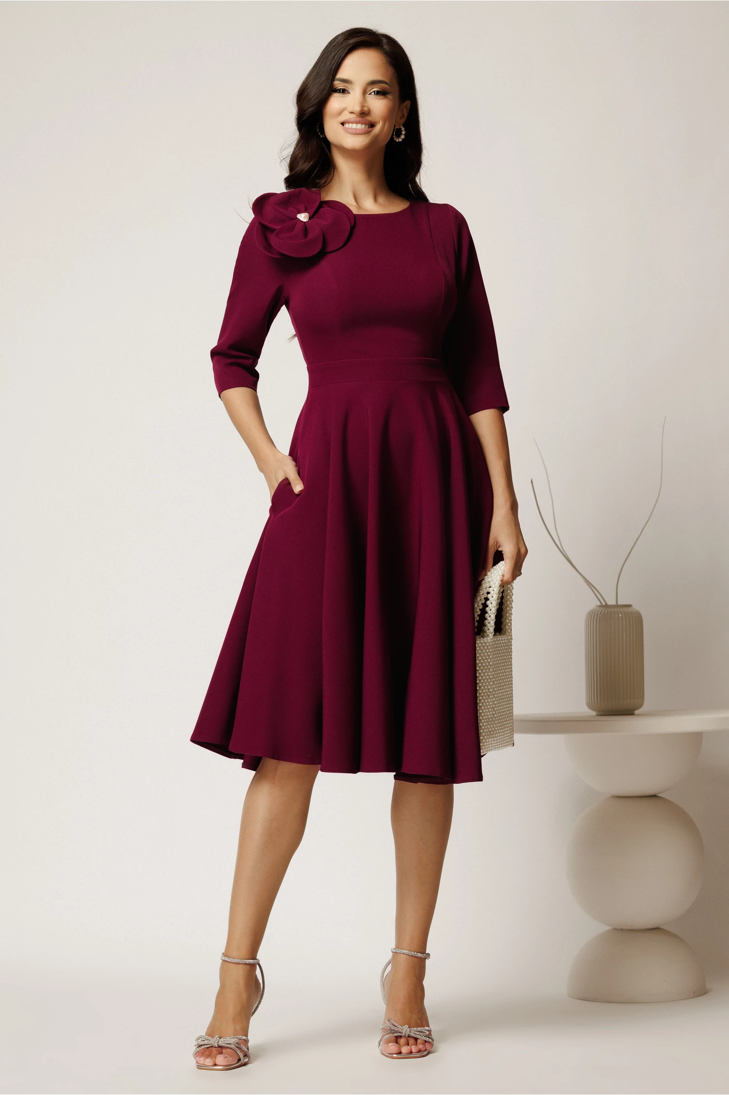 Rochie midi din stofa accesorizata cu floare nedetasabila la bust. Are decolteu rotund, maneci trei sferturi, croi clos si buzunare functionale.