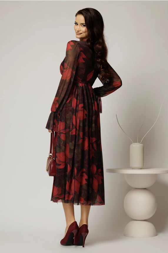 Rochie DY Fashion midi neagra cu imprimeu rosu din tulle fin in clos cu crapatura pe picior