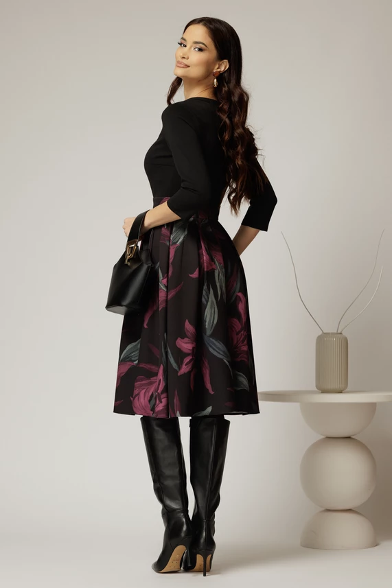 Este o rochie midi de zi cu fusta cu pliuri si imprimeuri. Rochia are un decupaj discret la decolteu si maneci trei sferturi.