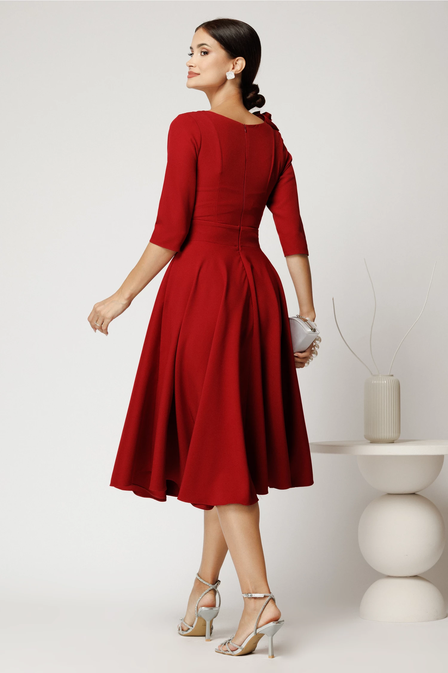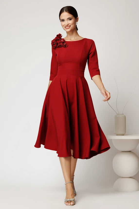 Rochie midi cu croi în clos si maneci trei sferturi, ideala pentru evenimente rafinate. Accesoriul floral 3D de la umar adauga un plus de originalitate si stil. Fabricata din material plin, care ofera sustinere si eleganta, rochia se potriveste perfect siluetelor clasice.