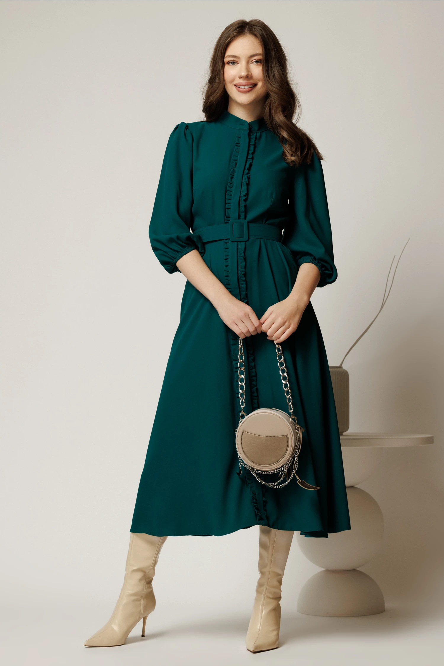 Alege la un eveniment sau in zilele de toamna, o rochie versatila pe care o poti purta in ambele situatii. Este o rochie midi cu gulerul tunica, volanase pe fenta si maneci bufante.