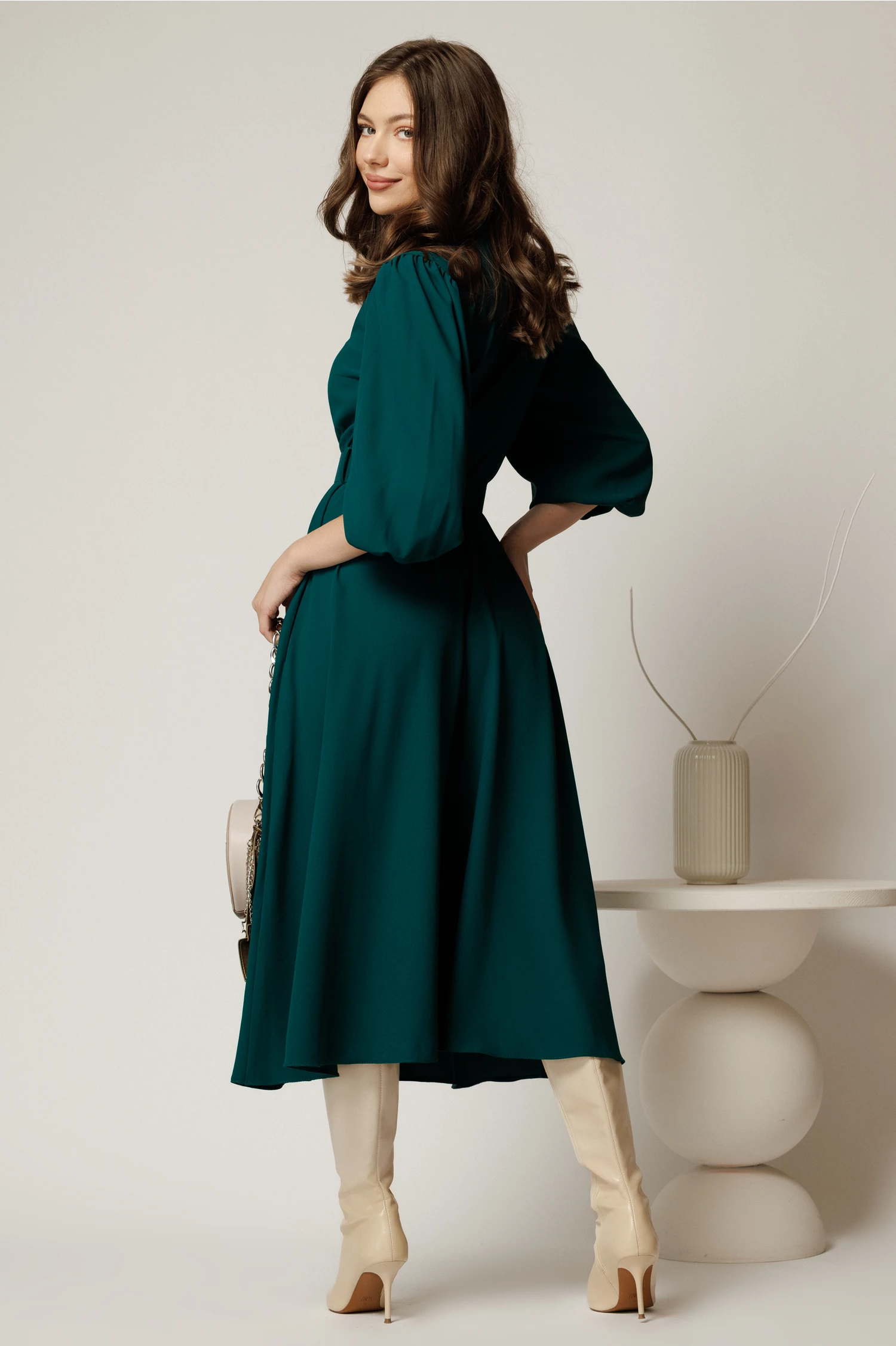 Rochie DY Fashion midi turcoaz cu maneci bufante si curea in talie