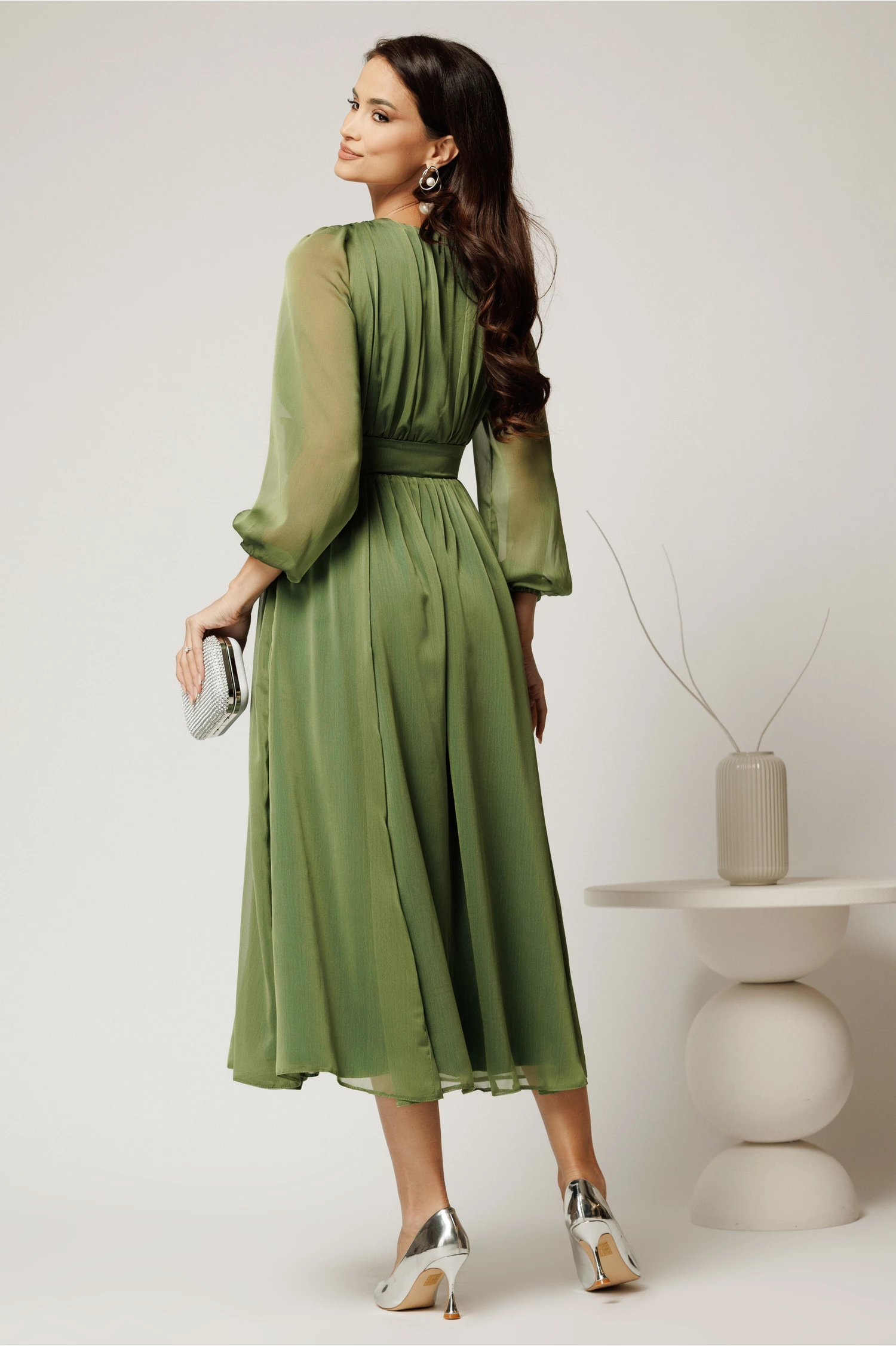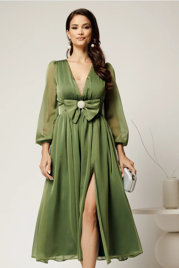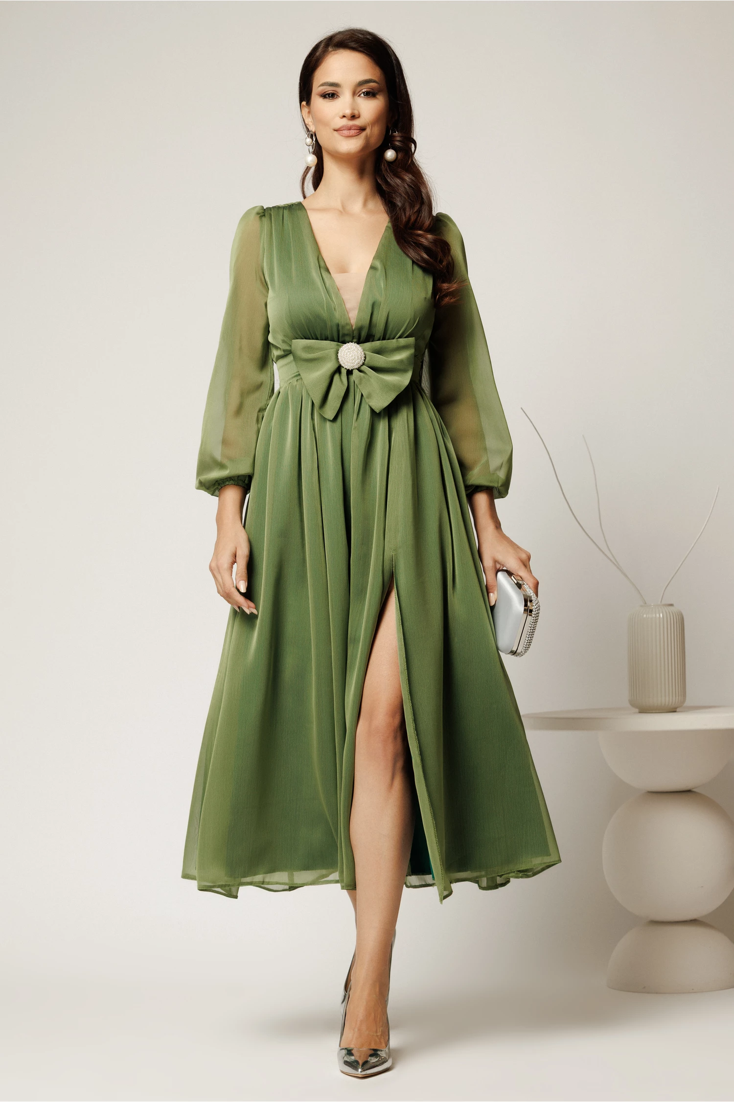 Rochie DY Fashion midi verde fistic din voal in clos cu funda maxi in talie
