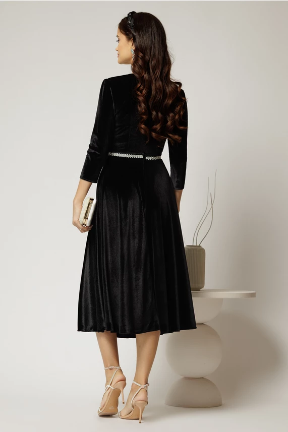 Rochie DY Fashion neagra din catifea cu decolteu in V si talia cu perle