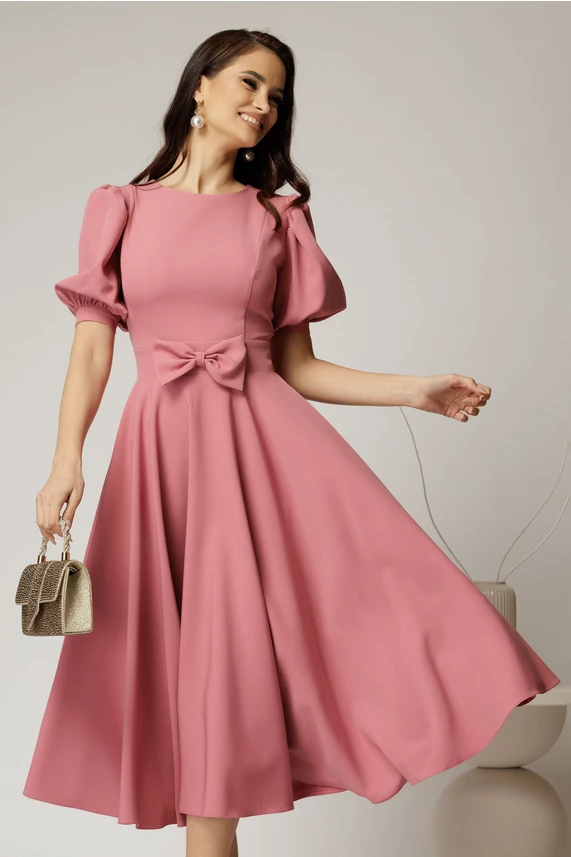 Rochie eleganta din stofa roz cu funda in talie. Are decolteu rotund, maneci scurte bufante si croi clos.