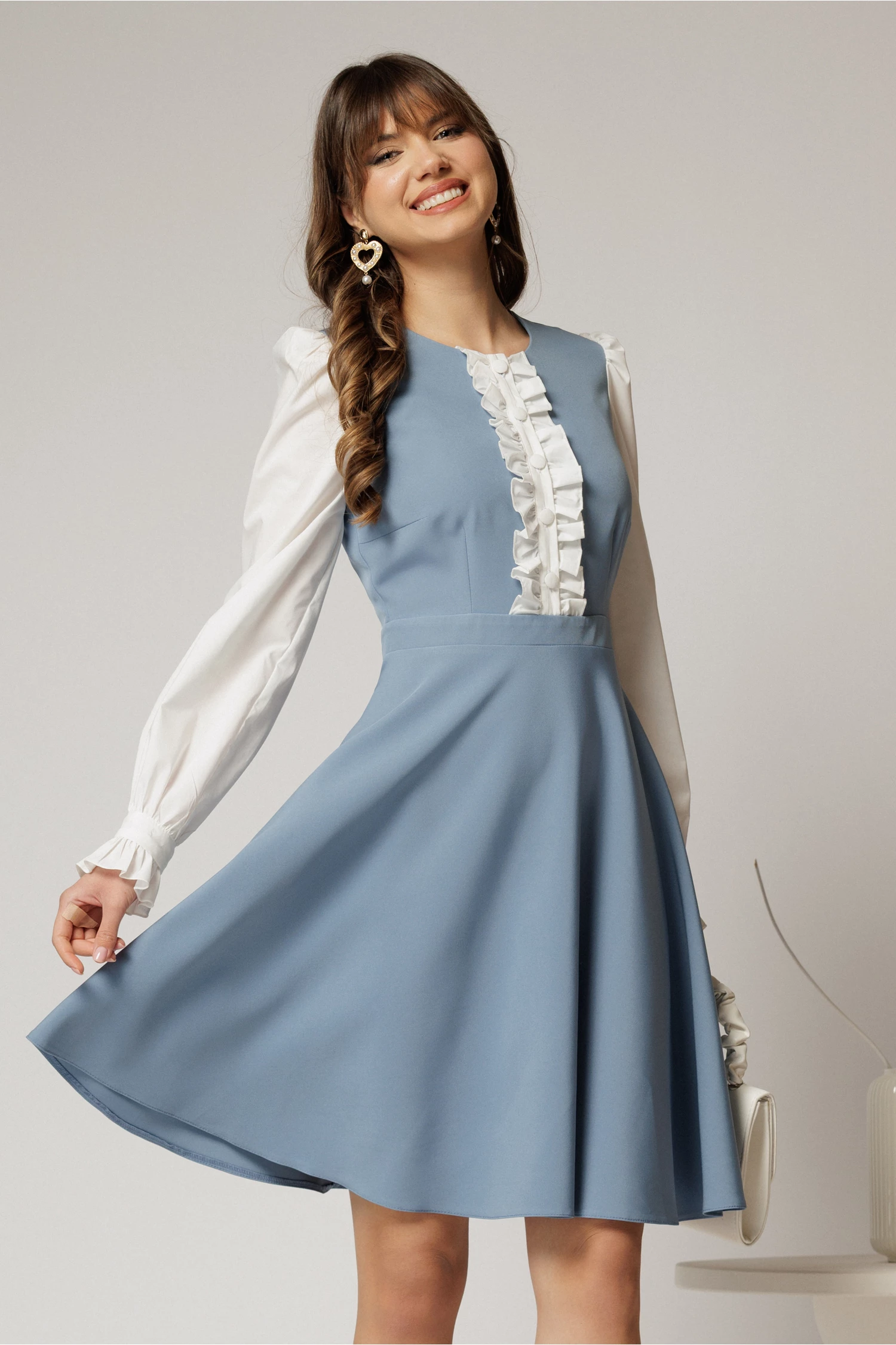 Este o rochie de zi eleganta, de culoare bleu, cu manecile lungi din poplin alb. Rochia are decolteul rotund, iar bustul accesorizat cu nasturi functionali si volanase.