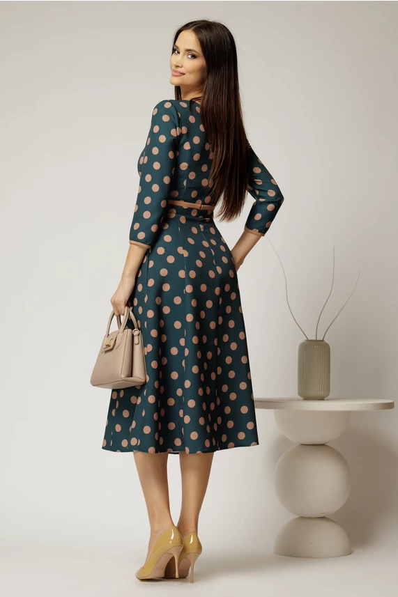 Este o rochie midi turcoaz cu buline, cu un croi clos foarte comod. Rochia are maneci 3/4, mic decupaj in V la decolteu si este accesorizata cu funde.