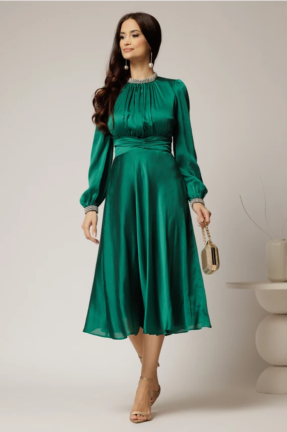 Rochie DY Fashion verde crud din voal cu perle la guler si maneci