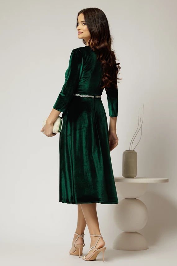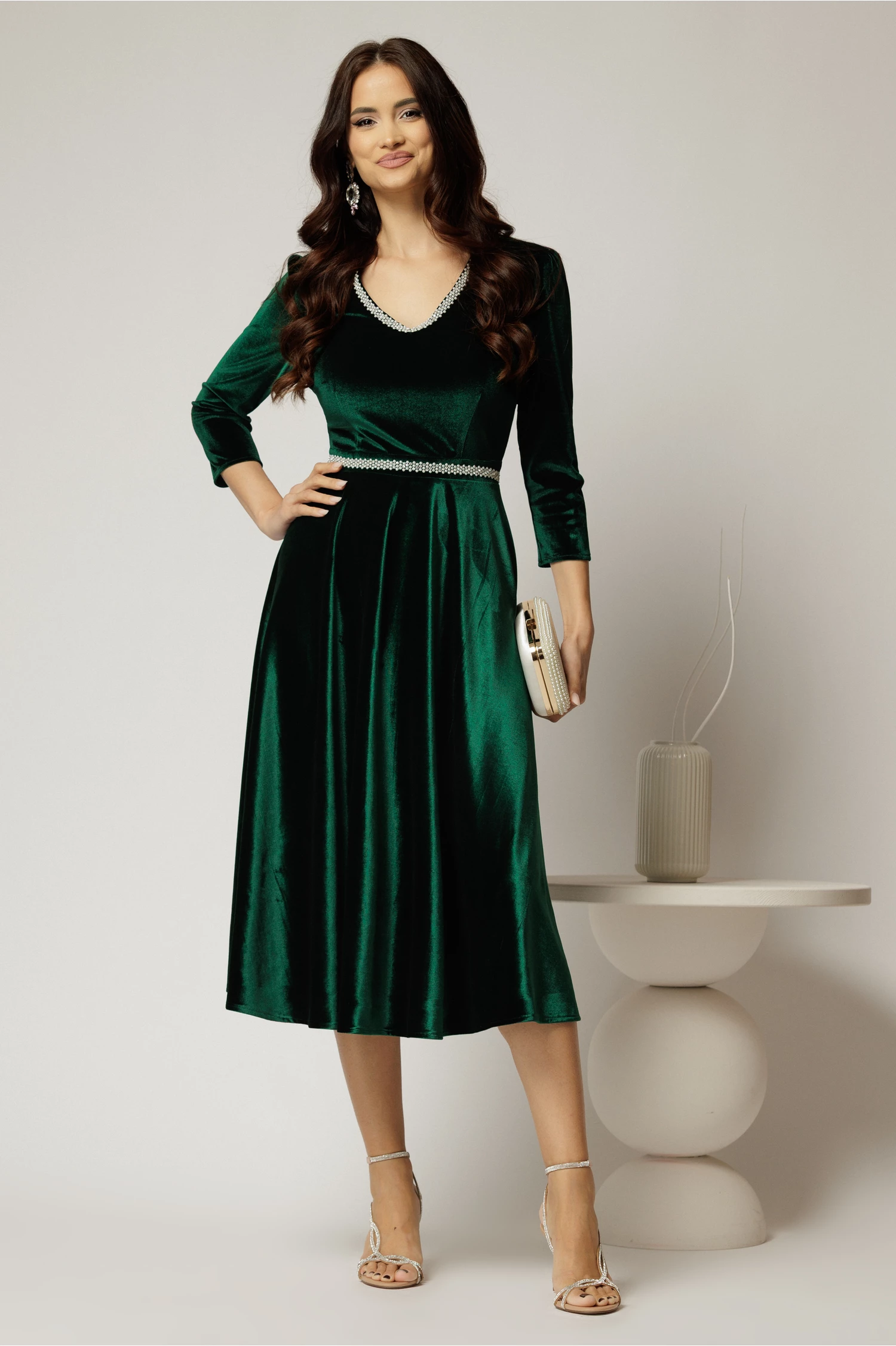 Rochie DY Fashion verde din catifea cu decolteu in V si talia cu perle