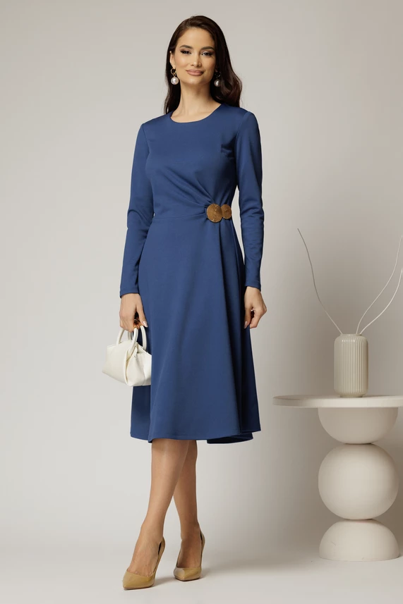 Este o rochie midi albastra cu croiul in clos, a carei talie este accesorizata cu detalii aurii. Rochie are decolteu rotund si manecile lungi.