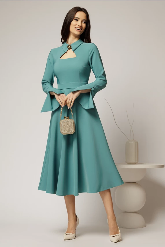 Rochie midi bleu cu guler tip camasa si decupaj la decolteu