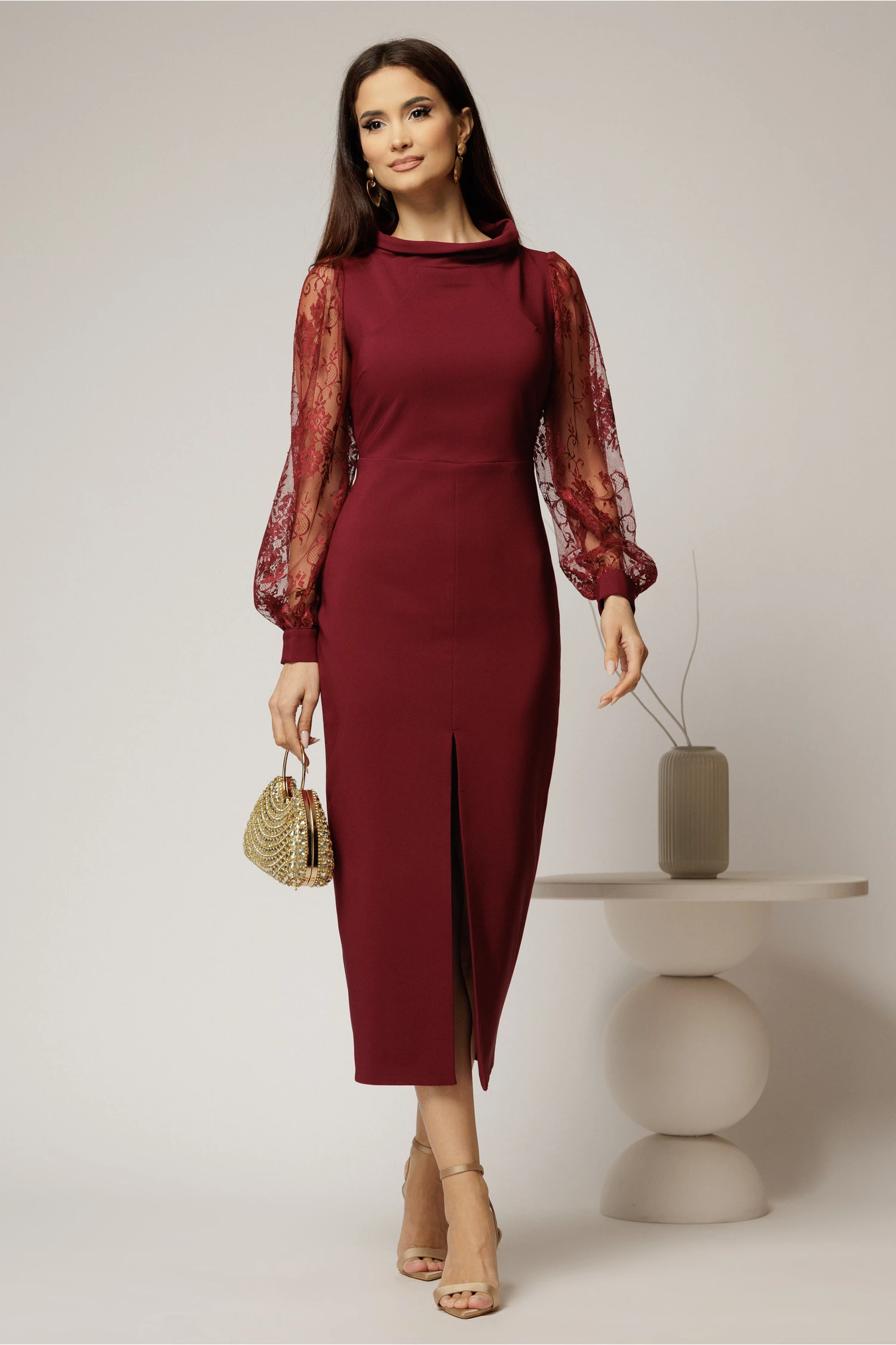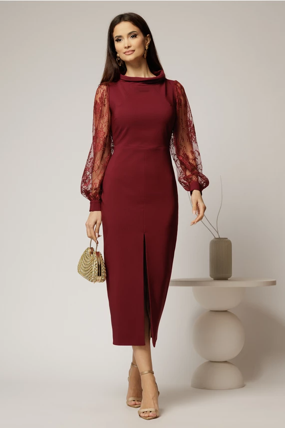 Este o rochie midi bordo de ocazie cu un croi conic ce va pune silueta in valoare. Rochia are manecile lungi bufante din dantela, decolteu barcuta si slit adanc.