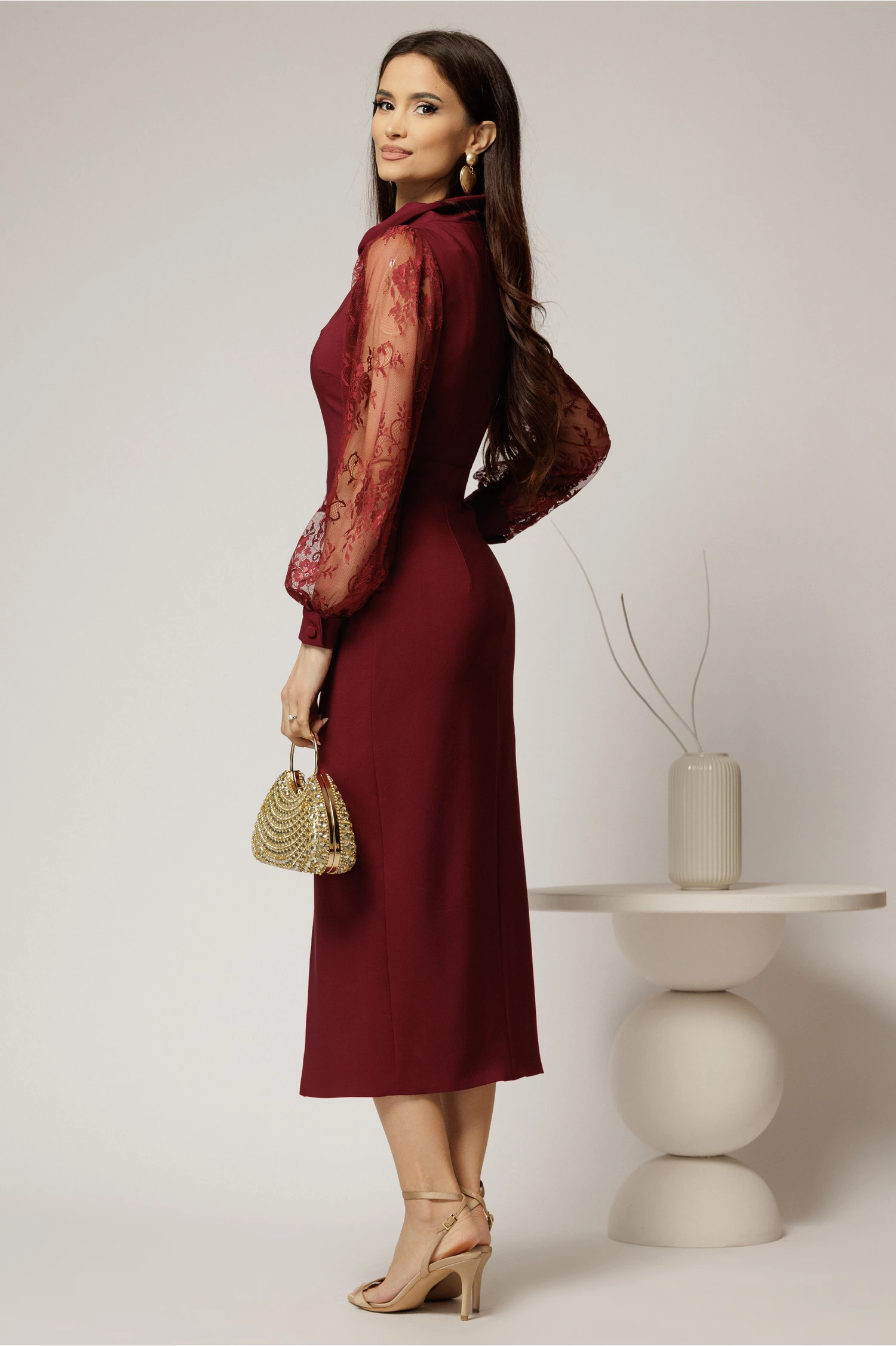Rochie midi bordo conica cu maneci din dantela si guler barcuta