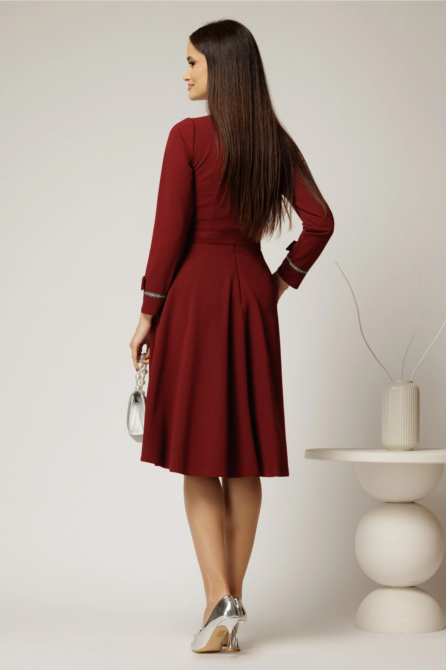 Este o rochie midi bordo din crep, cu fusta clos si decolteul rotund. Rochia are maneci lungi, bustul accesorizat cu nasturi si benzi elegante.