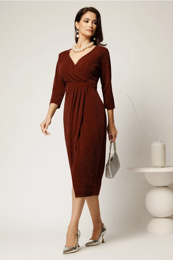 Rochie midi din fir lurex cu fronseu pe talie. Are decolteu in V petrecut, maneci trei sferturi si croi conic cu fusta petrecuta.