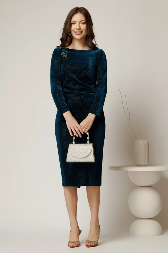 La evenimentele speciale alege sa porti o rochie midi de seara din catifea cu fir lurex din catifea turcoaz. rochia este accesorizata cu aplicatii in zona bustului.
