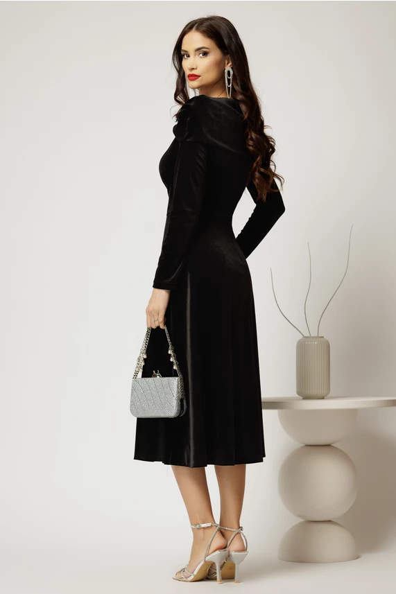 Rochie midi din catifea neagra cu umeri lasati si brosa