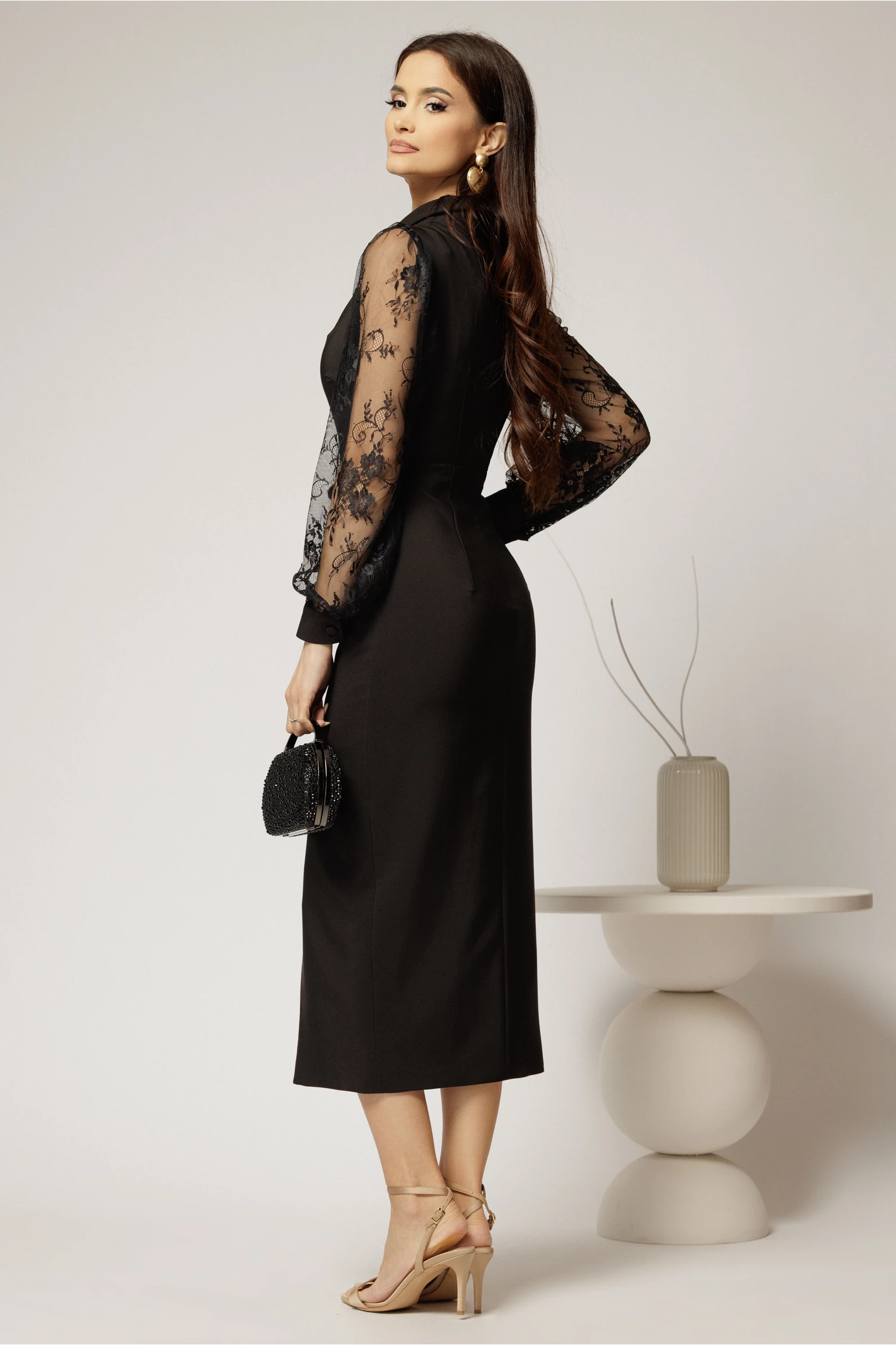 Este o rochie midi neagra de ocazie cu un croi conic ce va pune silueta in valoare. Rochia are manecile lungi bufante din dantela, decolteu barcuta si slit adanc.