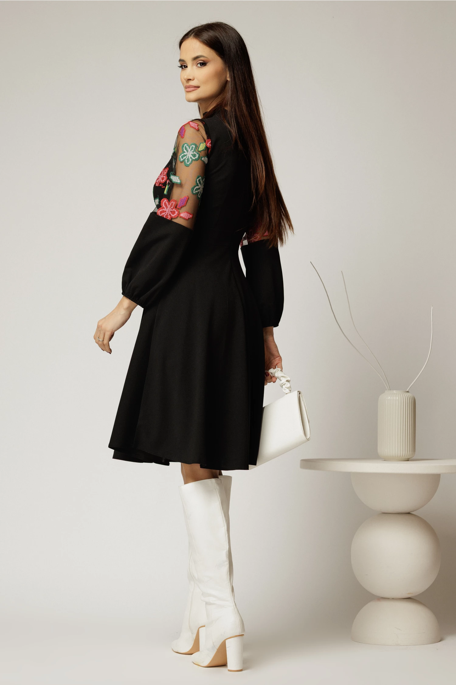 Este o rochie eleganta neagra, din crep, cu fusta clos si bustul din dantela florala colorata. Rochia are maneci lungi bufante si gulerul incretit.