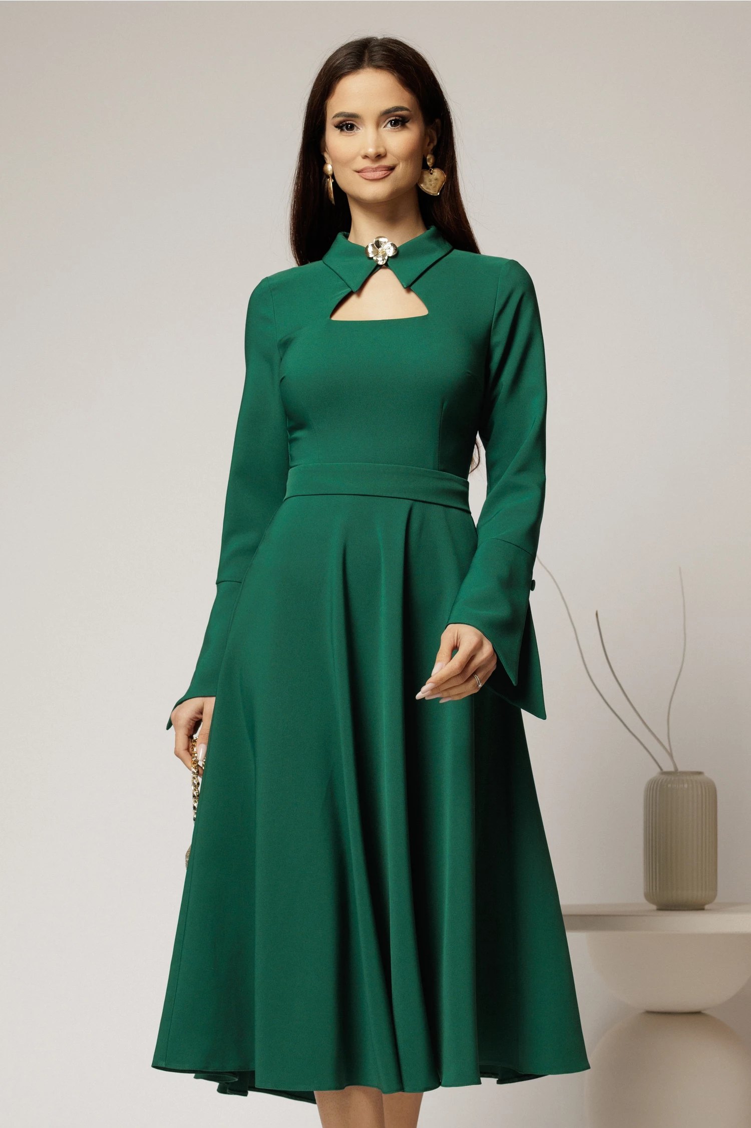 Rochie midi verde cu guler tip camasa si decupaj la decolteu