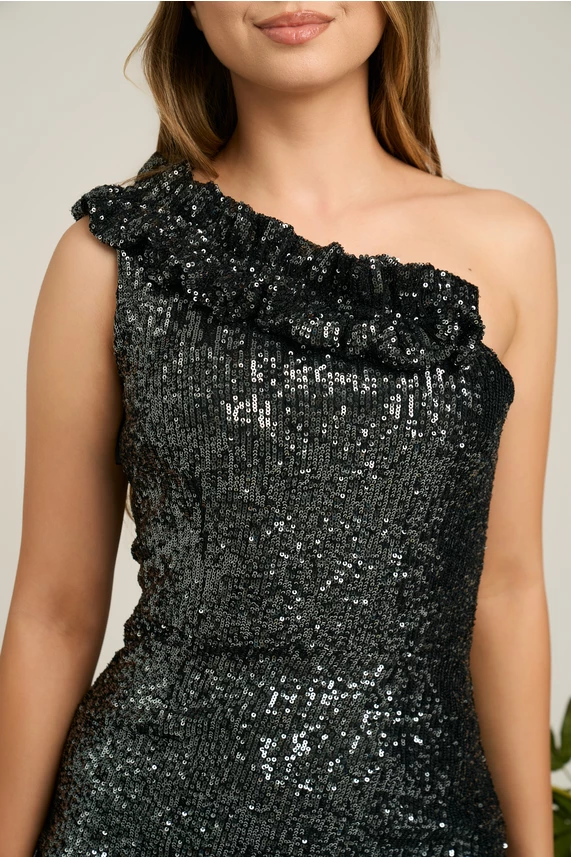 Rochie lunga eleganta din paiete. Are un umar gol, croi mulat si crepeu maxi pe fusta.