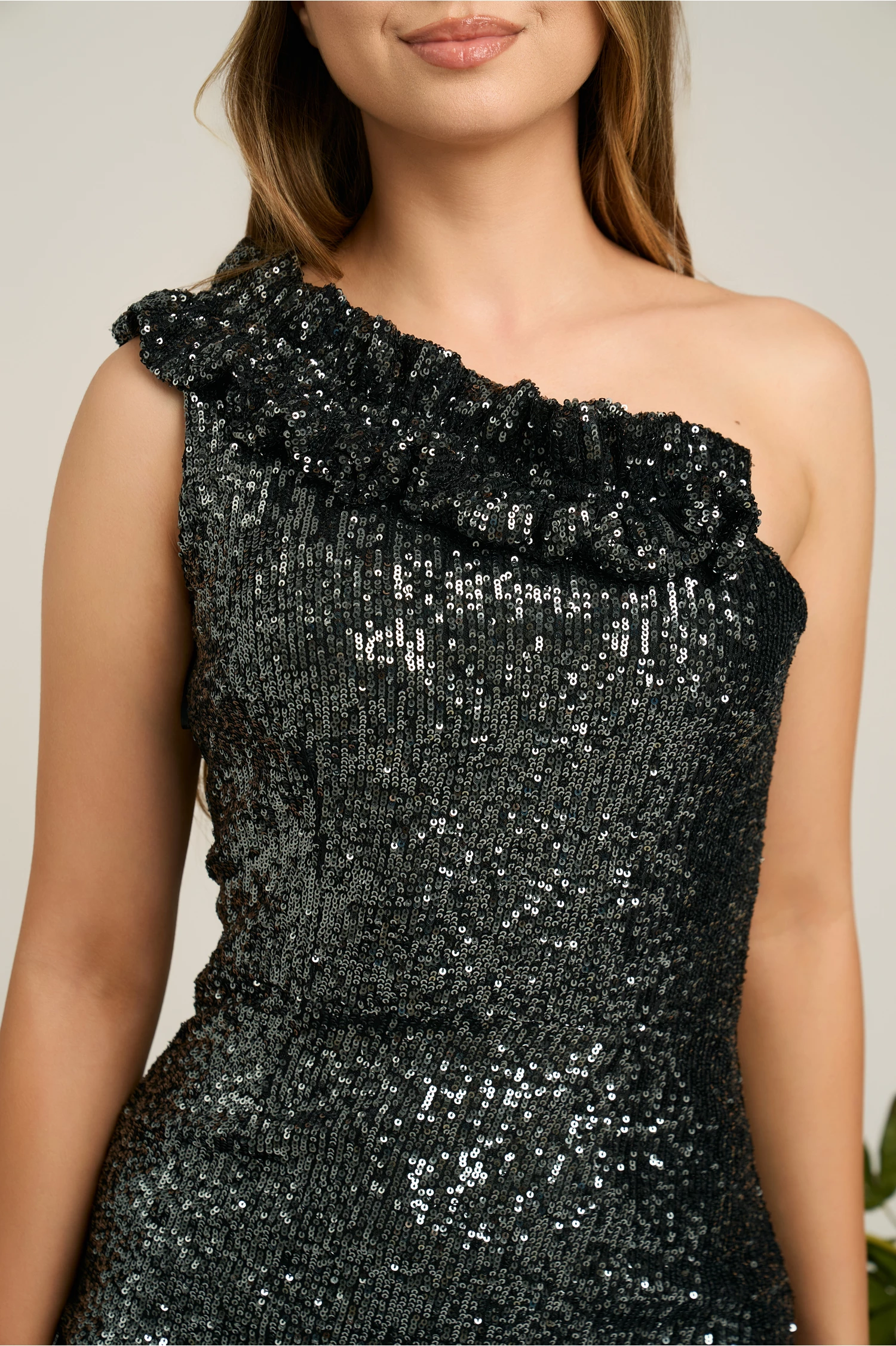 Rochie Moze gri din paiete cu un umar gol