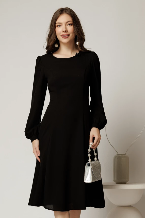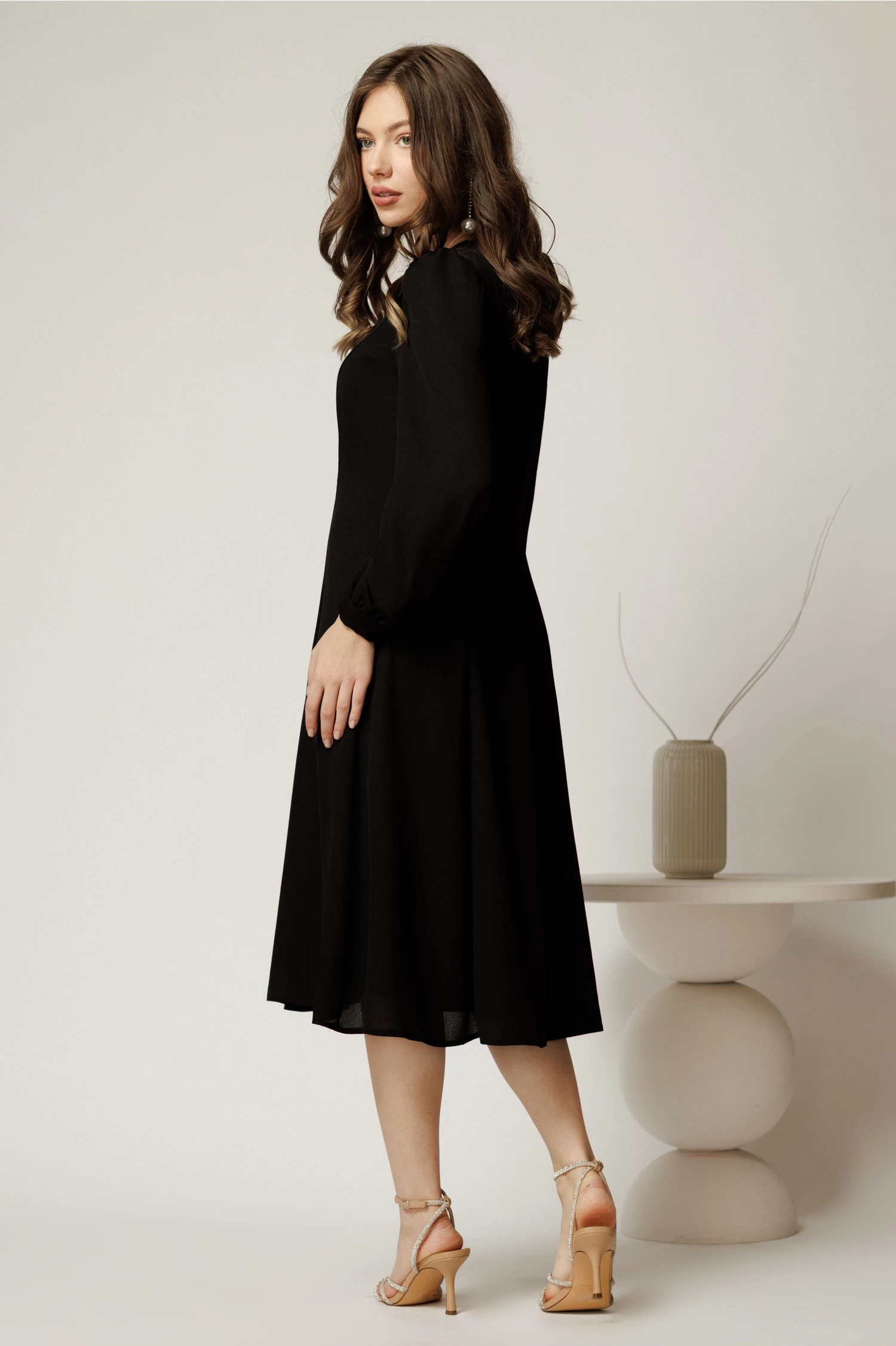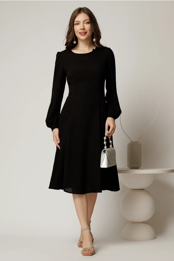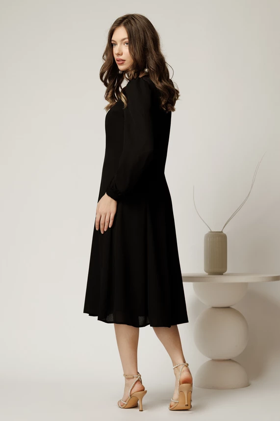 Este o rochie neagra lejera eleganta din voal usor creponat, al carei croi in clini avantajeaza orice silueta.