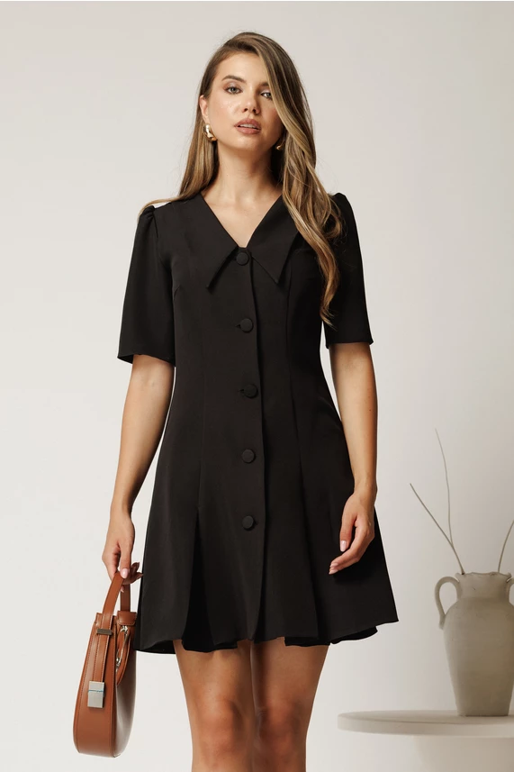 Rochie scurta neagra din stofa in clini cu nasturi si guler maxi