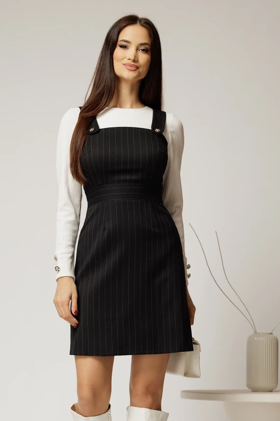 Este o rochie scurta office, cu un croi al fustei tip A, care da impresia unui sarafan. Rochia are maneci lungi din tricot, accesorizate cu nasturi.