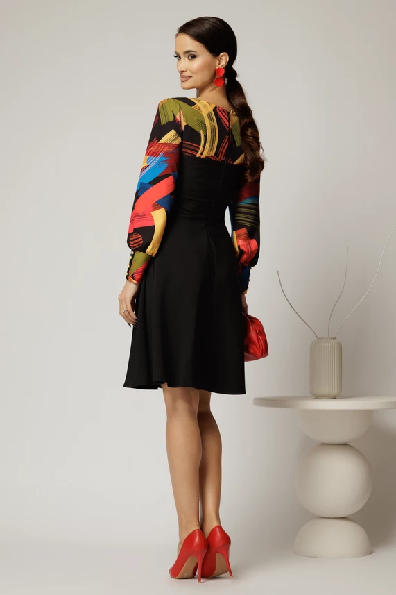 Rochie Andrada din stofa neagra cu funda si imprimeu colorat