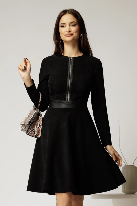 Rochie DY Fashion din stofa velur neagra cu fermoar metalic decorativ și inserții din piele