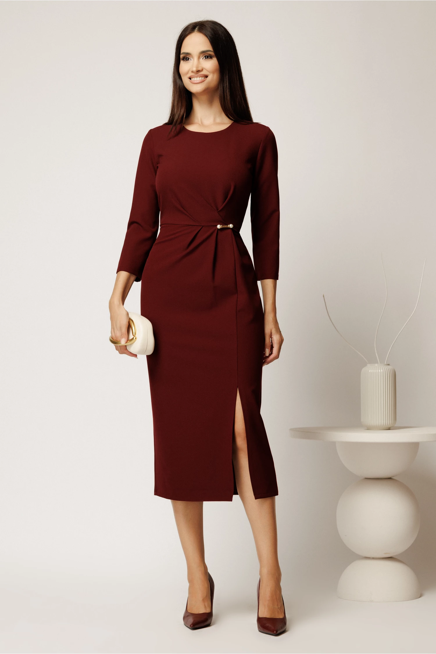 Rochie midi din stofa cu pense si accesoriu in talie. Are decolteu rotund, maneci trei sferturi si croi conic.