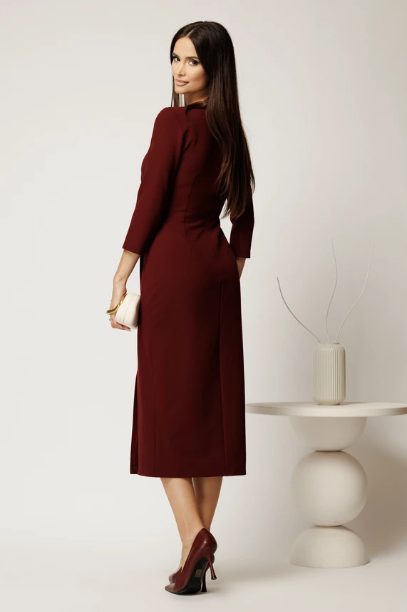 Rochie midi bordo din stofa conica cu pense si accesoriu in talie